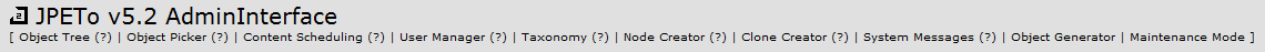 Die JPETo™ System ToolsZu den JPETo™ System Tools gelangt man, indem man im Admin-Modus (WYSIWYG Ansicht) bei einem beliebigen Objekt auf den EDIT-Button klickt. Dieser Klick öffnet das Einzelobjekt AdminInterface, darüber erscheint eine (projektspezifische) Auswahl der System Tools.